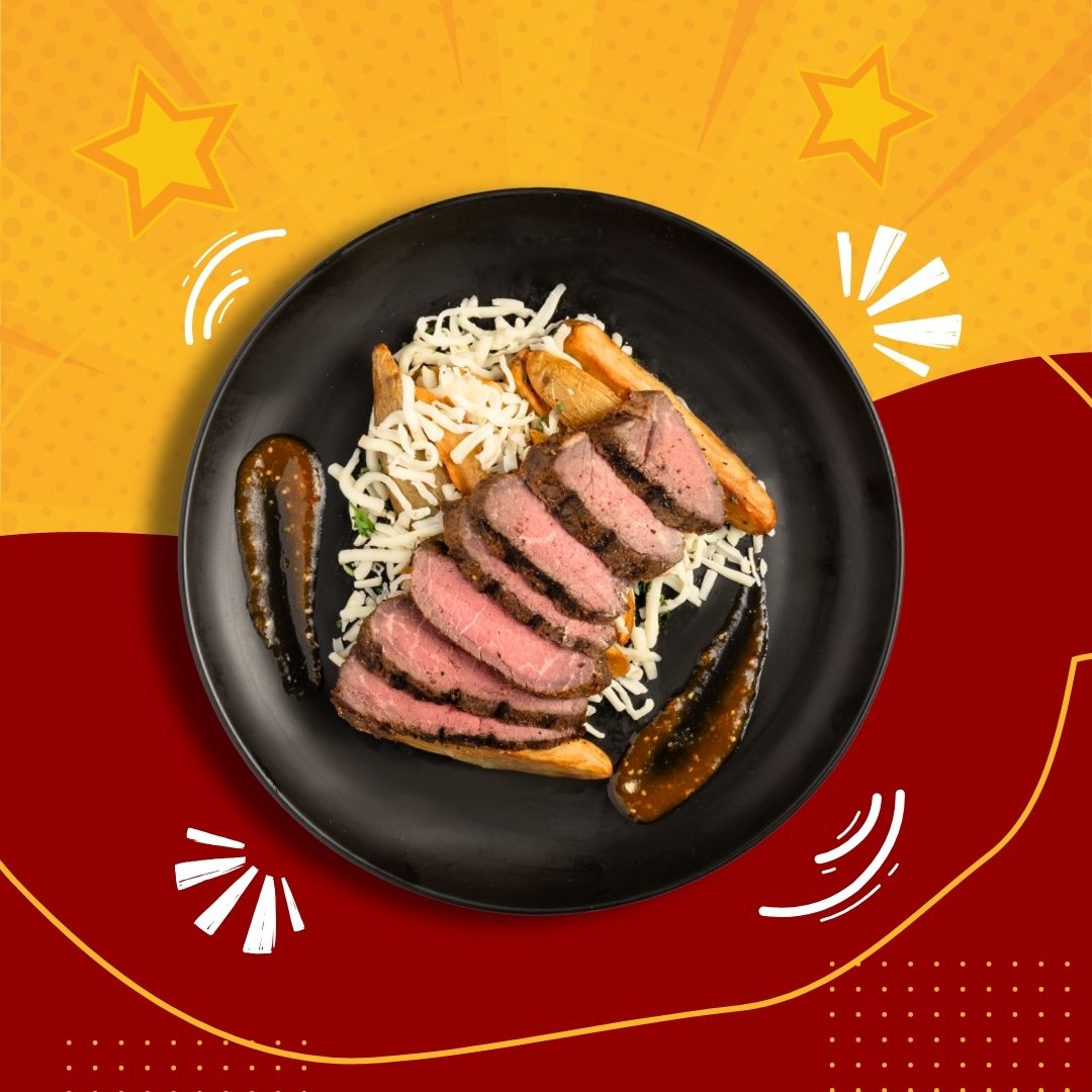 Savor the bold flavors of our Carne Asada Fries! This hearty dish features tender, fire-roasted sirloin, perfectly seasoned and sliced atop a bed of crispy Yukon Gold potato wedges, fried to golden perfection in beef tallow. Finished with a decadent drizzle of Queso Especial, a rich blend of Queso Blanco, Oaxaca, and Asadero cheeses, this indulgent meal delivers the perfect balance of crunch, melt-in-your-mouth beef, and creamy cheese. A must-have for steak lovers and comfort food enthusiasts alike!